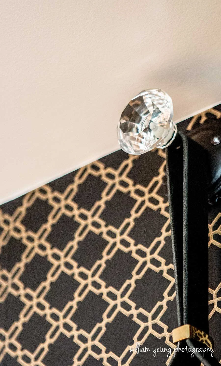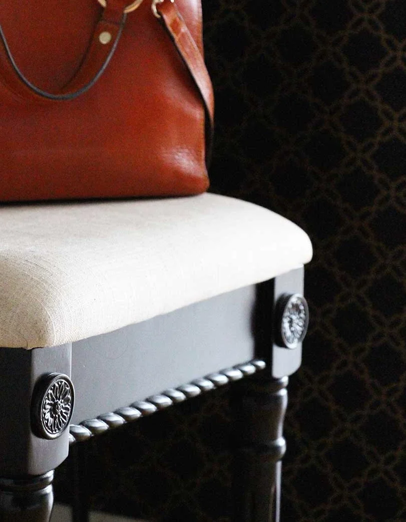 I fell in love with this wallpaper as soon as I saw it online, and even though I was nervous about using it I totally changed my mind when I got the sample. Black and gold is one of my favorite combinations and this one added the perfect amount of glam femininity to the space. To balance it - and avoid giving hubby a heart attack - I decided to go with a very masculine console table with hairpin legs and a black leather equestrian mirror. Looking for the right pieces was a big challenge due to the size of the space, so I decided to contact small manufacturers on Etsy. I had THE BEST experience working with them and got custom and hand-made amazing pieces! I can't thank enough Garrett and Dendro Co for their excellent service.